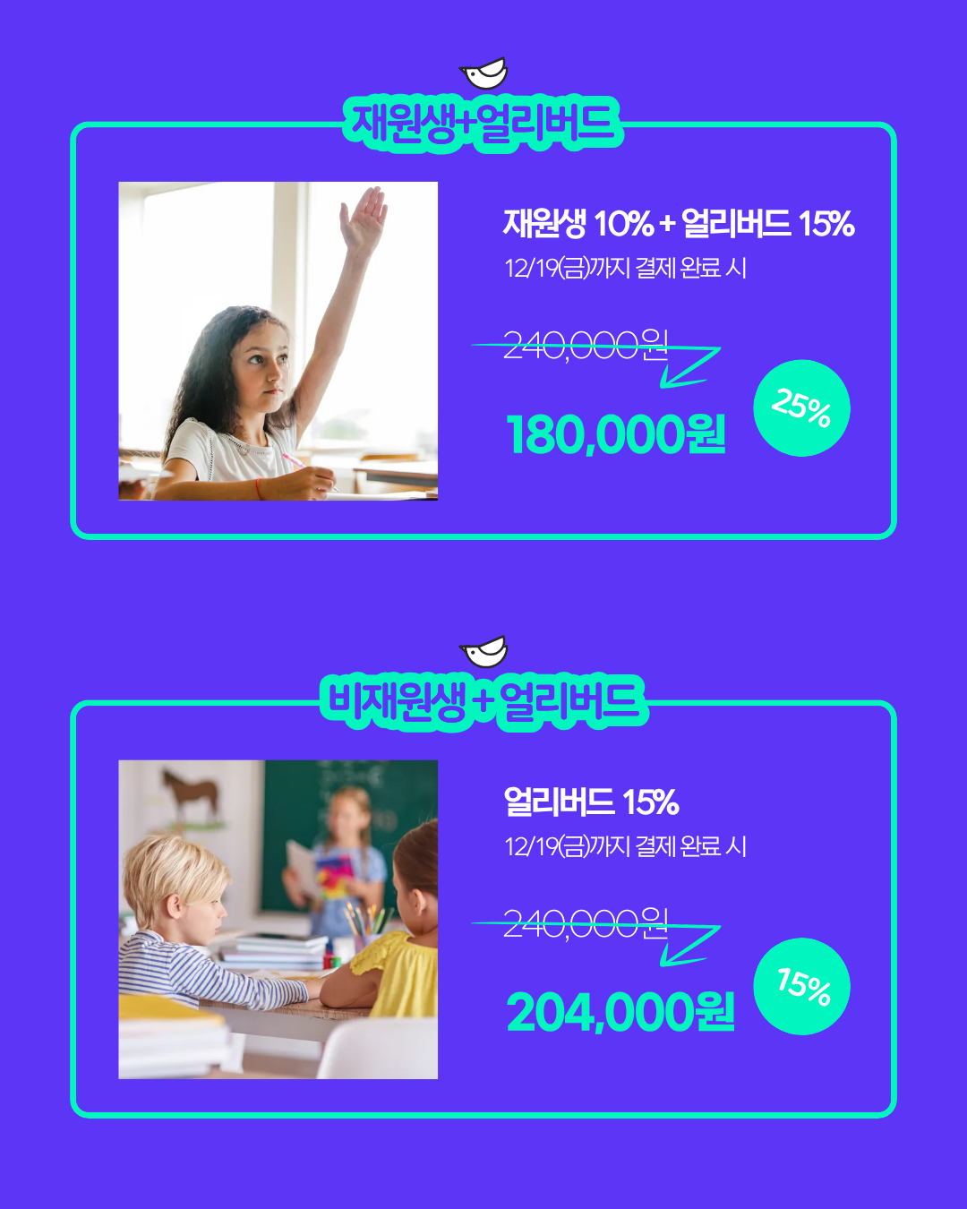 → 재원생 & 얼리버드 등록 시 총 25% 할인 적용 (180,000원)
